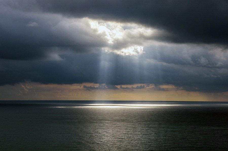 With a satisfied exhalation of breath, Laxmi sat beside Anna in the tube’s mouth, her sling of rock tools collected during her climb dumped in a jangling heap behind her, and followed Anna’s gaze out to sea. A hazy mist completely obscured the horizon, sea and sky blended together with no division, but rather a gradient from light grey descending into darkness where the horizon should have been. The distant, tall clouds they noticed earlier had now coalesced into a mass of towering giants, crenellated turrets at their peaks reaching for the heavens, and merging at their base to a solid dark wall. Nearer to hand the sun still sparkled off the sea, all the brighter for the contrasting darkness beyond. A breeze lifted a lock of Laxmi’s hair, and she turned to Anna, frowning.